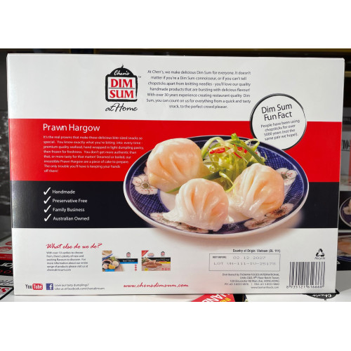 Chen's Dim Sum Prawn Hargow - это настоящая жемчужина азиатской кухни, которая перенесёт вас в мир аутентичного дим-сама. Каждая пельменка с креветкой аккуратно завернута в лёгкое тесто, которое сохраняет сочность и натуральный вкус креветок. Настоящие кусочки креветок делают эти закуски особенными — с первого укуса вы почувствуете свежесть и качество премиальных морепродуктов.