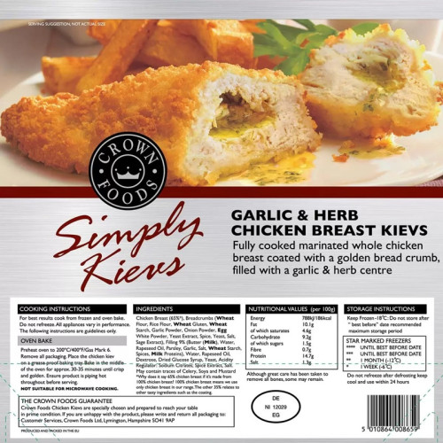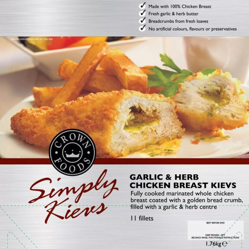 Garlic and Herb Chicken Breast Kievs — это полностью приготовленные куриные грудки, замаринованные и покрытые золотистой панировкой из свежего хлеба. Внутри каждой грудки спрятан ароматный чесночно-травяной центр из свежего сливочного масла с пряными травами. Изготовлены из 100% куриной грудки без добавления искусственных красителей, ароматизаторов и консервантов. Идеальны для быстрого и вкусного ужина, сохраняя сочность и насыщенный вкус курицы.