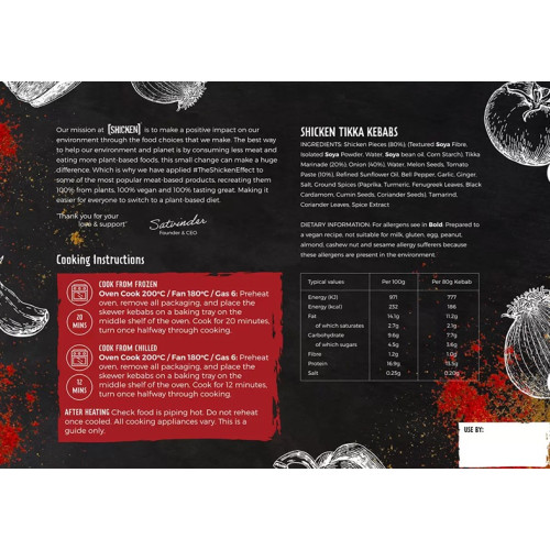 Shicken Vegan Meat-Free Tikka Kebab Skewers - это необычная и современная интерпретация классического тикка-кебаба в полностью растительном исполнении. Сочные кусочки Shicken - уникальной plant-based альтернативы куриному мясу - маринуются в ароматных специях в стиле индийской тикки, а затем аккуратно нанизываются на деревянные шпажки.
