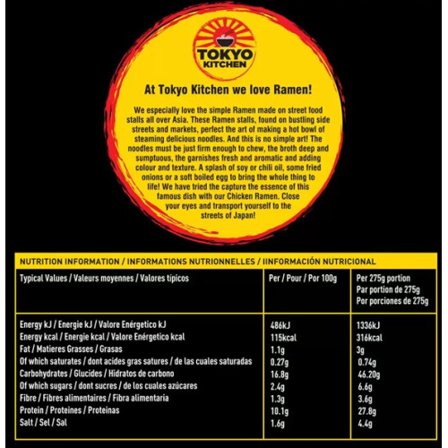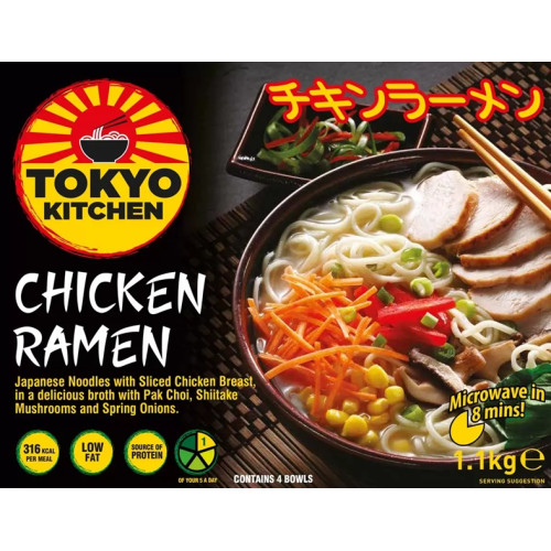 Tokyo Kitchen Chicken Ramen — это аутентичный японский рамен, который приносит в ваш дом настоящий вкус Японии. В каждой миске вы найдёте тонкую японскую лапшу, нежные кусочки куриной грудки, сочный пак-чой, ароматные шиитаке и зелёный лук, всё в лёгком, насыщенном бульоне.